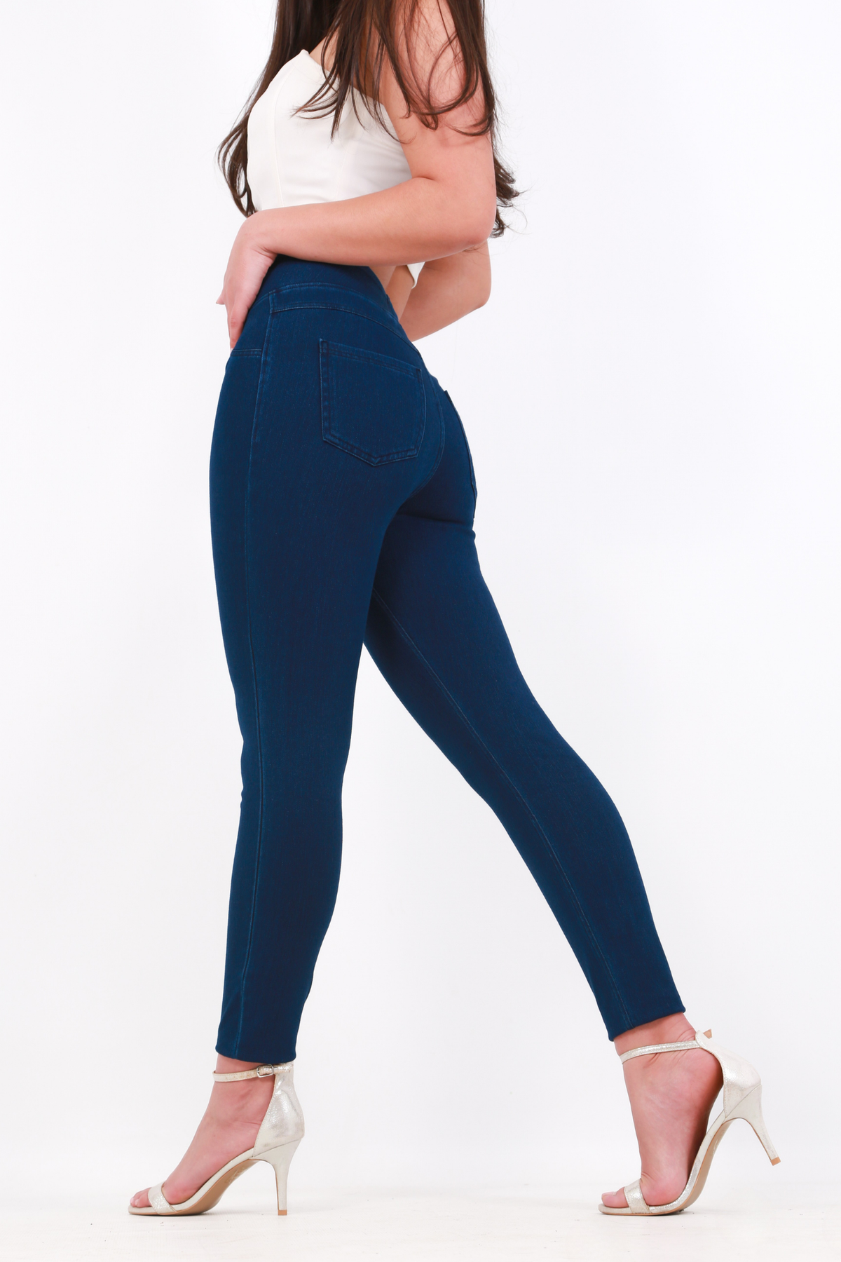 Elevate your casual style with our High-Waisted Stretchy Knit Denim Leggings in dark blue. These leggings combine the classic look of denim with the comfort of a soft, stretchy knit. Featuring a flattering high waist and convenient back and side pockets, they offer both style and functionality. Perfect for everyday wear, these leggings are a versatile addition to any wardrobe.