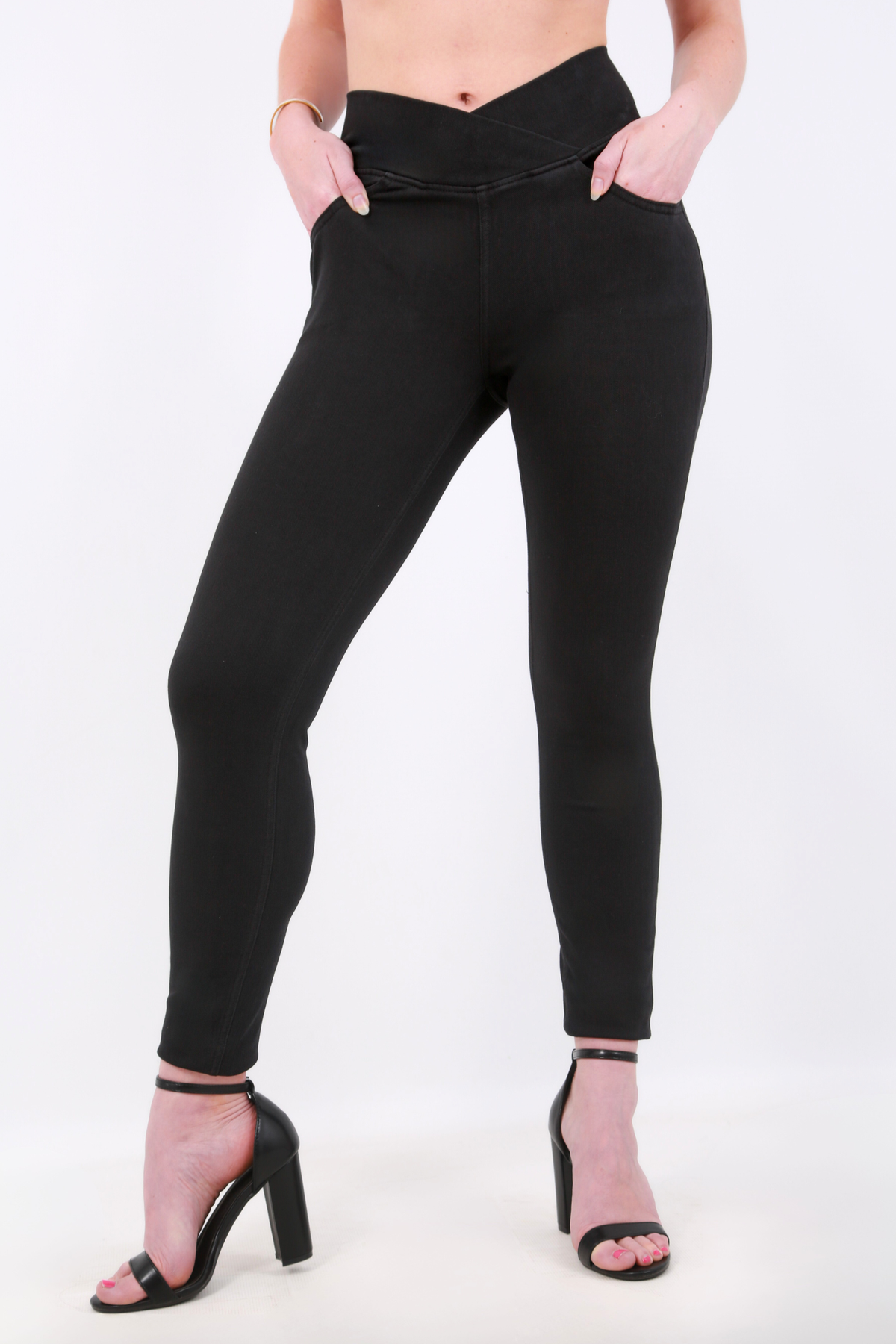 Experience a sleek, sculpted fit with our Skinny Crossover V-Waist Leggings. Designed to flatter your figure, these high-rise leggings feature a modern crossover waistband that cinches the waist and enhances your curves. The soft, stretchy knit fabric mimics denim while offering all-day comfort and freedom of movement — perfect for both office chic and off-duty style.