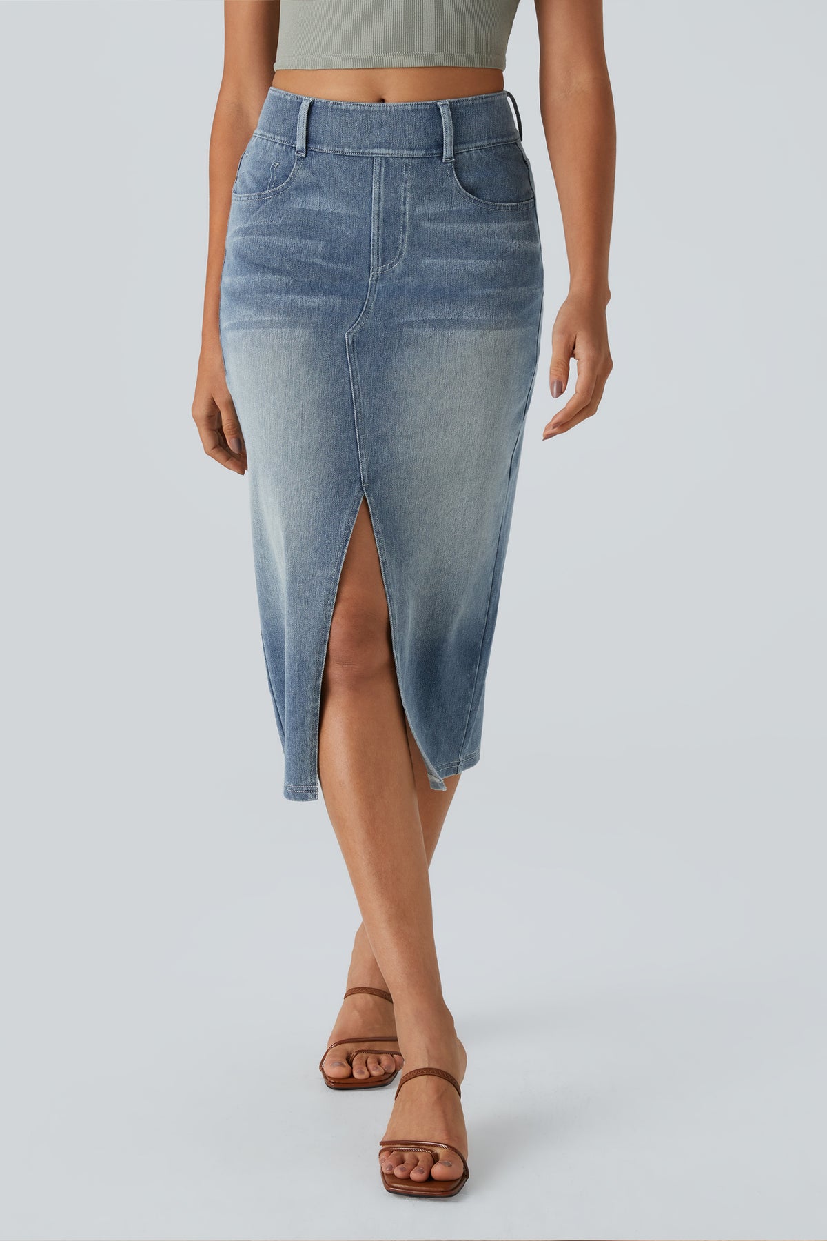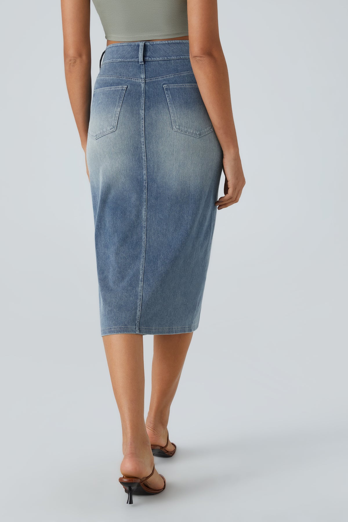Meet the denim skirt that isn’t really denim. Our Snugz Super Stretch Midi Skirt is made from ultra-comfy, stretchy pseudo-denim that flatters every curve while keeping you comfortable all day. Designed with a classic mid-wash look and a front slit for easy movement, this skirt is perfect for dressing up or down.